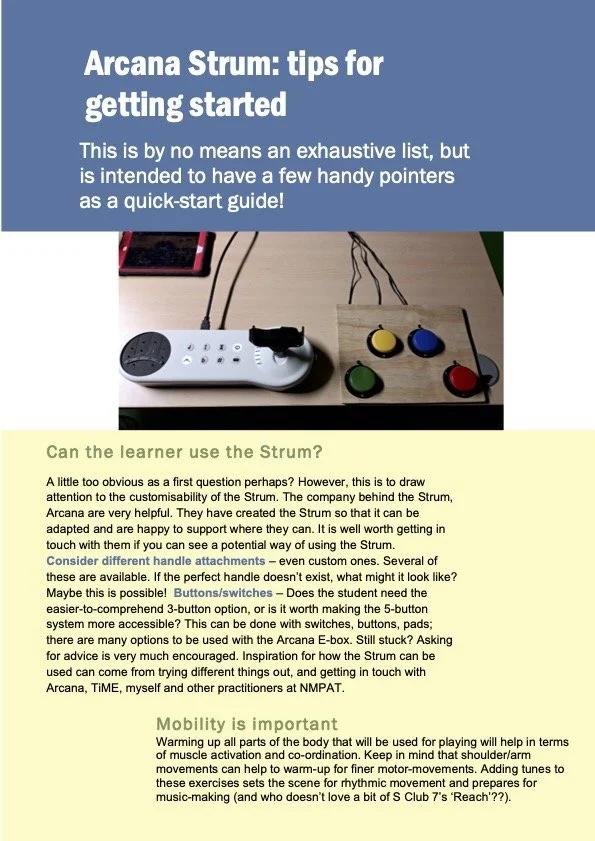 We are delighted to share this in-depth and informative case study, conducted in partnership with the Northampton Music and Performing Arts Trust and inclusive music leader Rebecca Price. This case study investigates how the Arcana Strum can enhance access to music making and facilitate progressive and accredited learning for young people with additional needs and disabilities. Along with the case study you will find a ‘Getting Started - Tips’ document plus some handy guides on using the Strum from Arcana Instruments.
