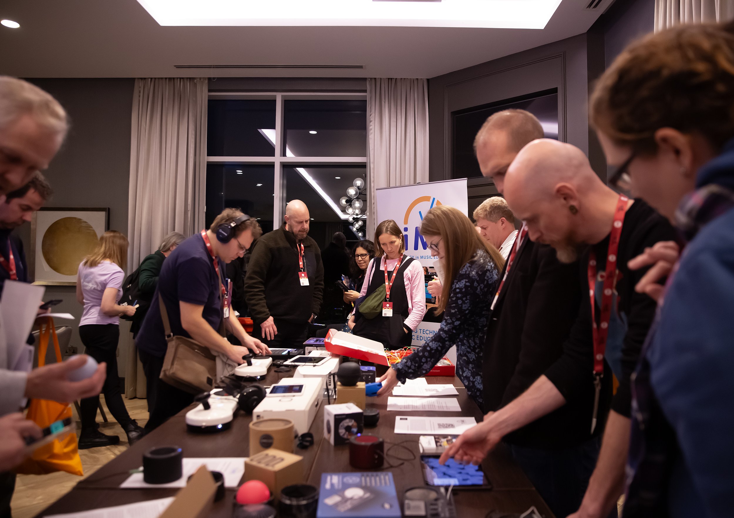 People interacting with tech gadgets at an exhibition table indoors, wearing ID badges.